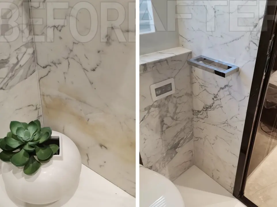 Natursteinflächen in Luxusimmobilien sind langlebig, aber nicht immun gegen das Leben. Säurehaltige Flüssigkeiten (Wein, Zitrone), Mikrokratzer und Kalkablagerungen können die Oberfläche mit der Zeit abstumpfen lassen. Unser Ansatz ist rein mechanisch und restaurativ. Wir verwenden keine abblätternden Beschichtungen. Wir schleifen, honen und polieren den Stein selbst, schließen die Poren und erzeugen einen natürlichen, strapazierfähigen Glanz, der atmet.